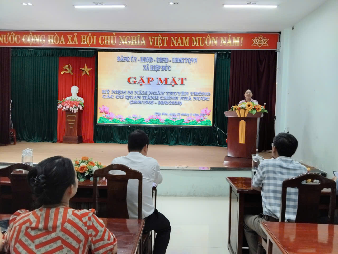 Phát biểu tại buổi gặp mặt, đồng chí Trần Thị Thu Huyền, Phó Bí thư thường trực Đảng ủy chúc mừng và biểu dương những nỗ lực, phát huy tốt vai trò, trách nhiệm của các cơ quan hành chính nhà nước trong công tác tham mưu cho Đảng ủy, HĐND, UBND xã thực hiện tốt nhiệm vụ chính trị của địa phương trong giai đoạn đổi mới, góp phần vận hành mô hình chính quyền địa phương 02 cấp thông suốt. Trước yêu cầu, nhiệm vụ mới mỗi cán bộ, công chức, viên chức, người lao động trong cơ quan hành chính của xã cần tiếp tục phát huy tinh thần trách nhiệm, đạo đức công vụ, rèn luyện phẩm chất và nâng cao năng lực chuyên môn, tận tụy phục vụ Nhân dân.