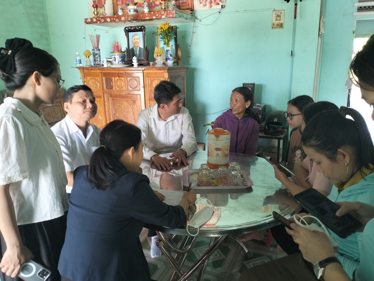 Ông Nguyễn Phước Niên- Phó chủ tịch UBND xã trò chuyện cùng gia đình em Thùy Dương, học sinh trường THCS Phan Bội Châu