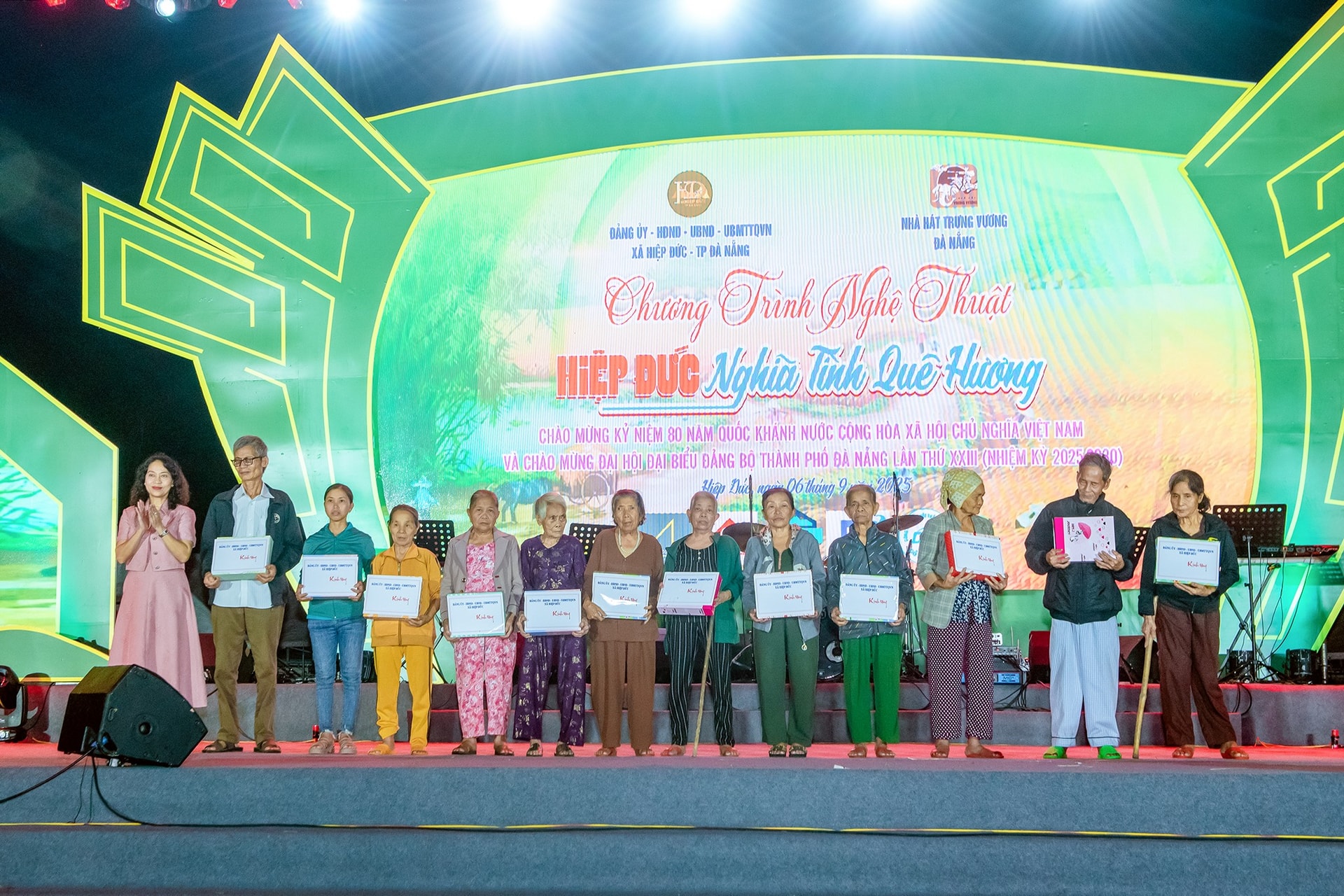 Chương trình được thể hiện bởi các nghệ sĩ: Quang Hào, Huỳnh Thật, Tịnh Y Thảo, Hoài Ny, Nam Sơn, Ksor Sơn và các diễn viên đến từ Nhà hát Trưng Vương. Tại chương trình, Ban Thường vụ Đảng ủy xã Hiệp Đức công bố quyết định thành lập Ban vận động Quỹ Khuyến học, khuyến tài của xã.