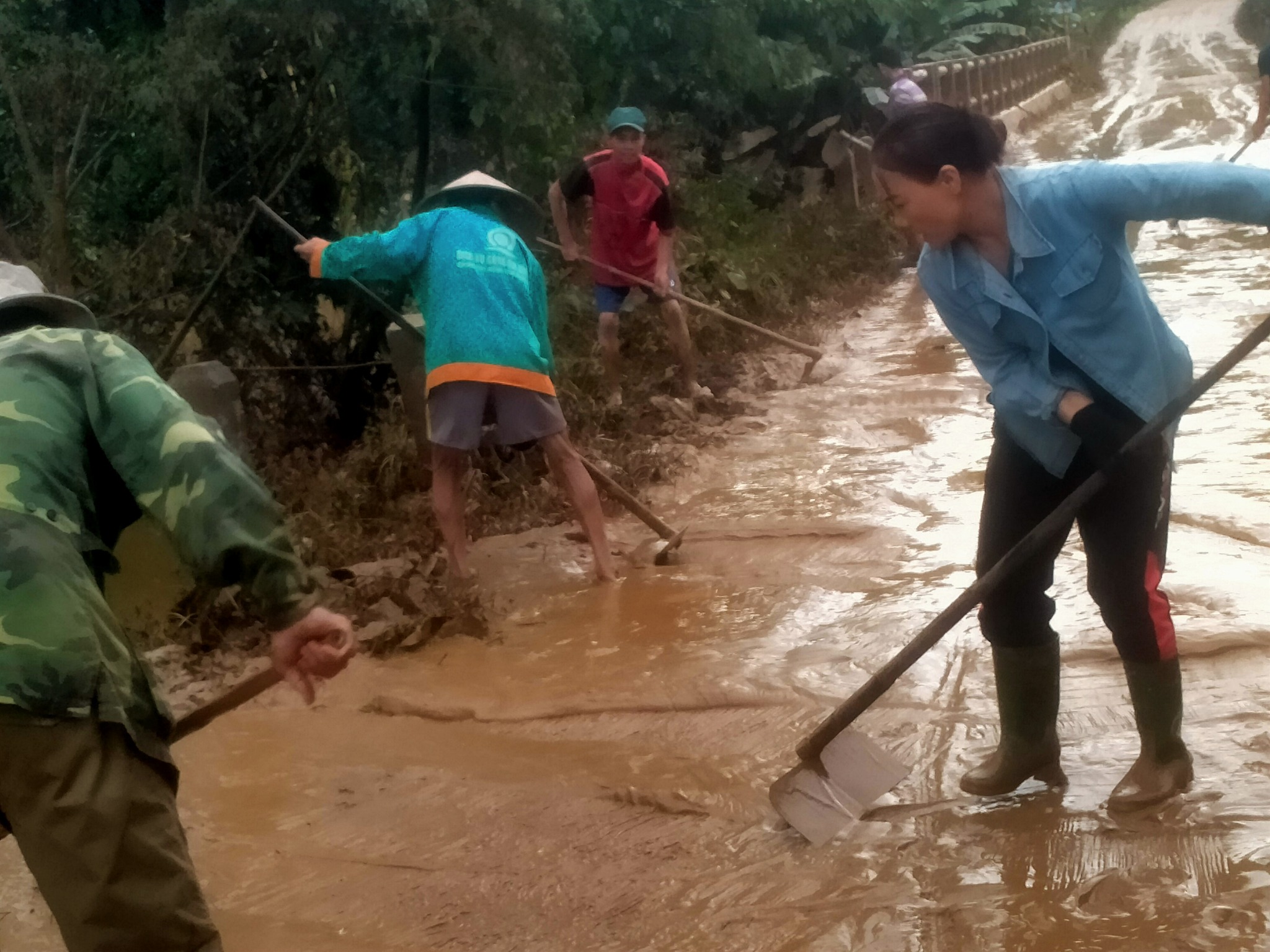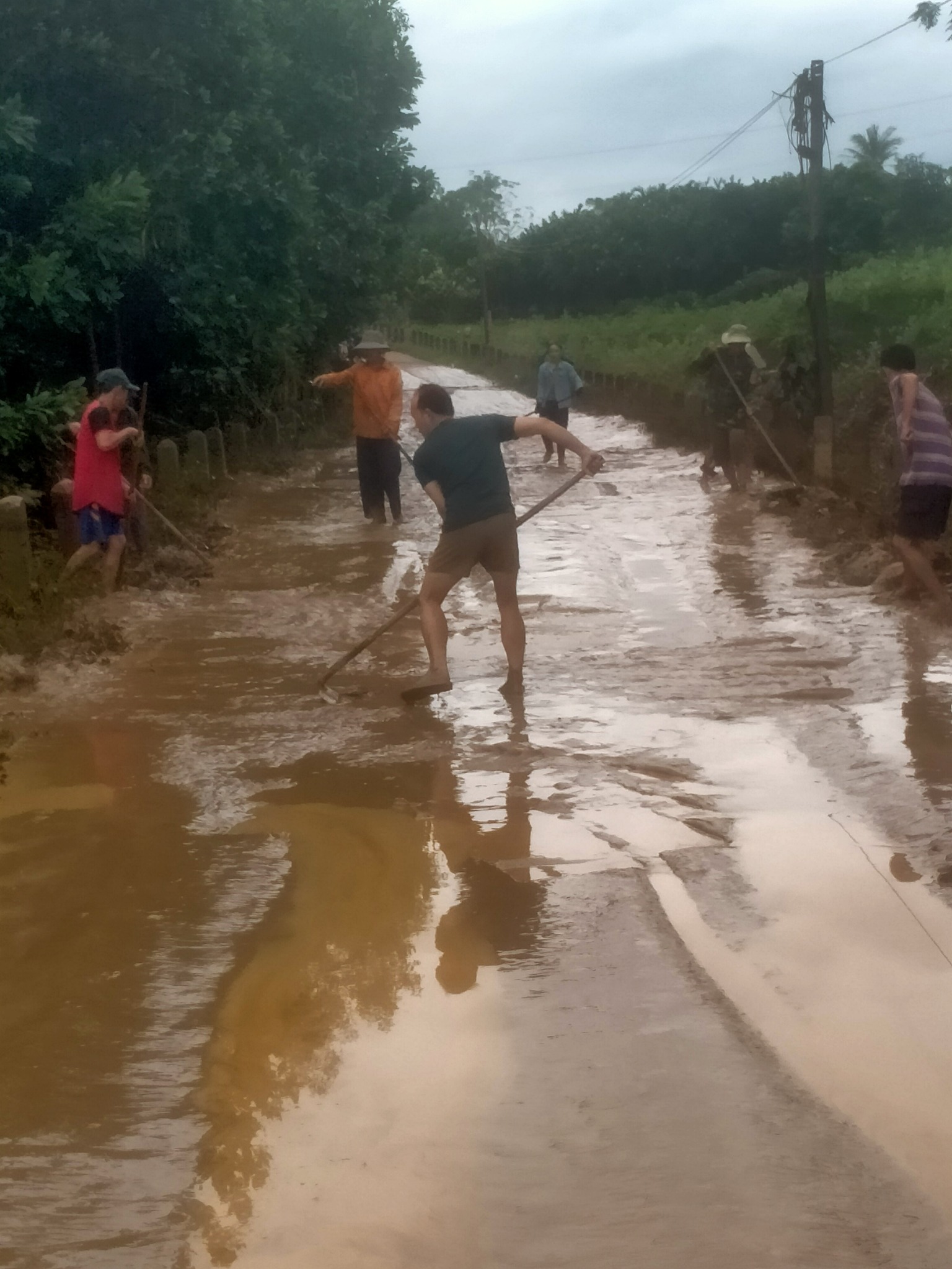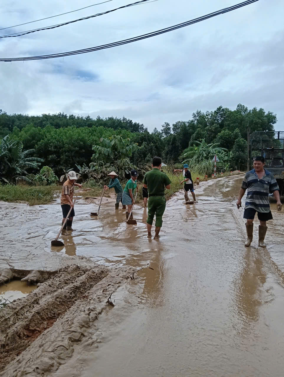 Sau đợt lũ lụt, nhiều tuyến đường trên địa bàn xã bị bùn đất, cây cối ngã đổ gây cản trở việc đi lại của Nhân dân và học sinh, Ban Nhân dân các thôn Trà Linh Đông, Bình Kiều đã chủ động vận động bà con ra quân dọn dẹp, khơi thông các tuyến đường, thu gom rác thải và san gạt bùn đất.