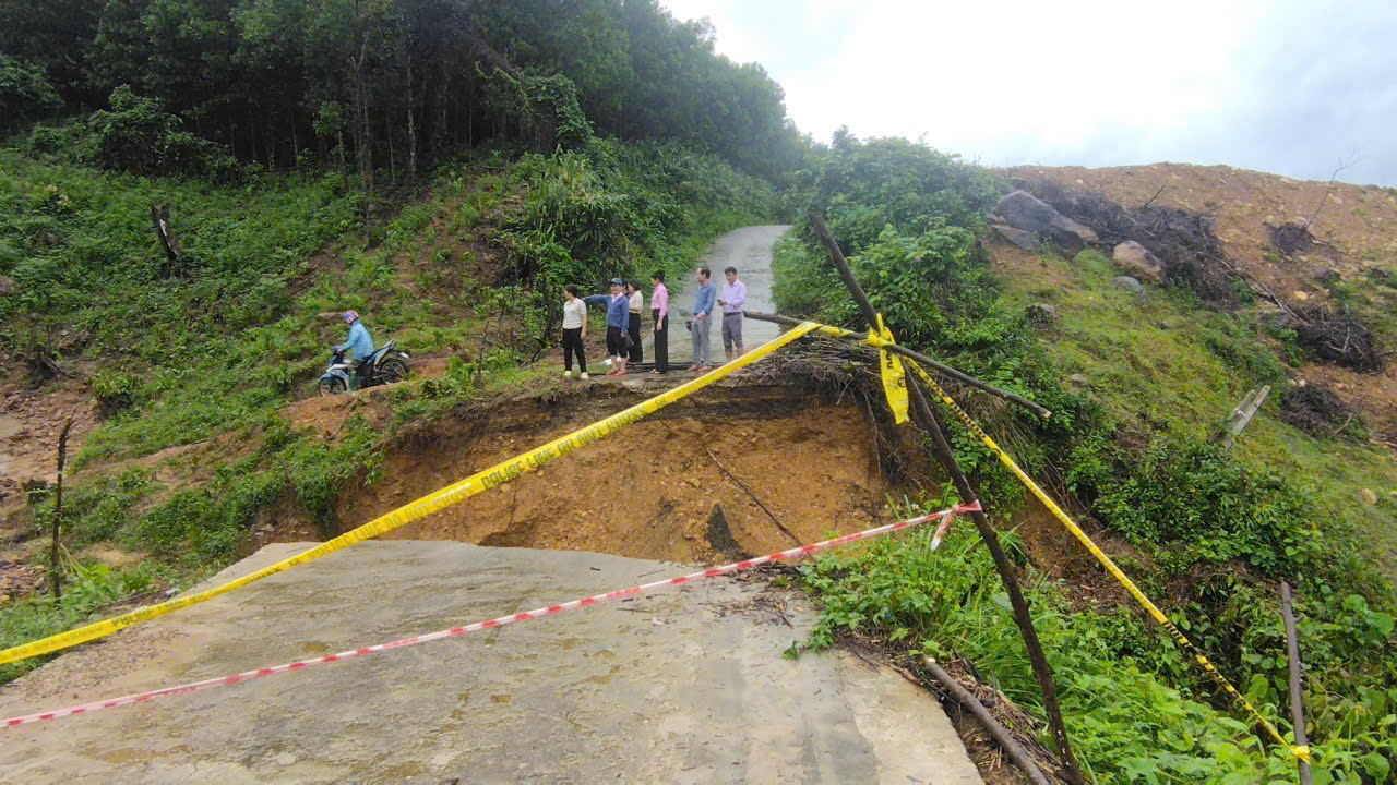 Tại tuyến đường ĐH5, từ cầu Trà Linh đi đường Trường Sơn Đông, đoạn qua cống Đồng Sạ đã bị đứt gãy, chia cắt hoàn toàn, khiến xe máy và ô tô không thể lưu thông.