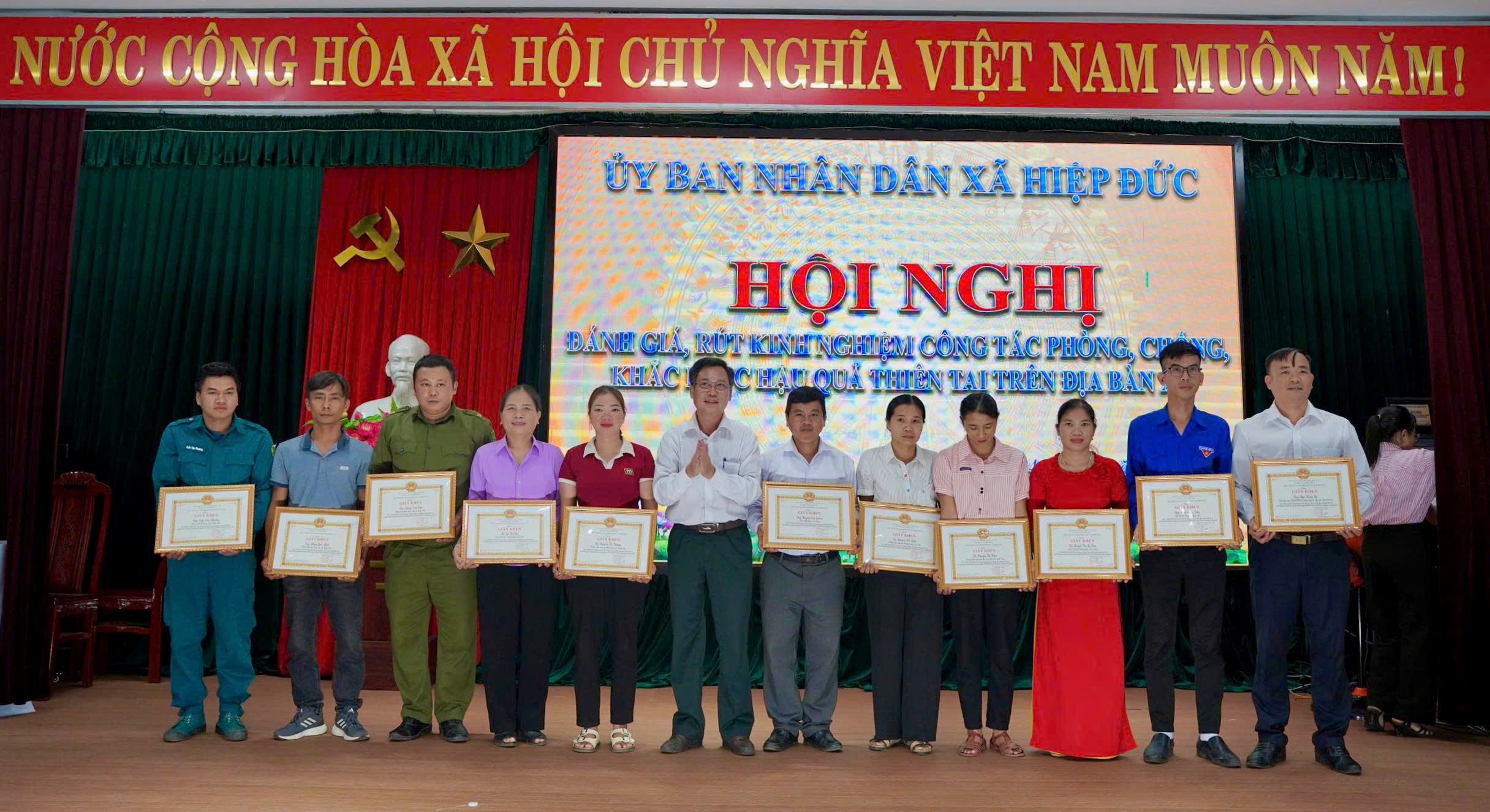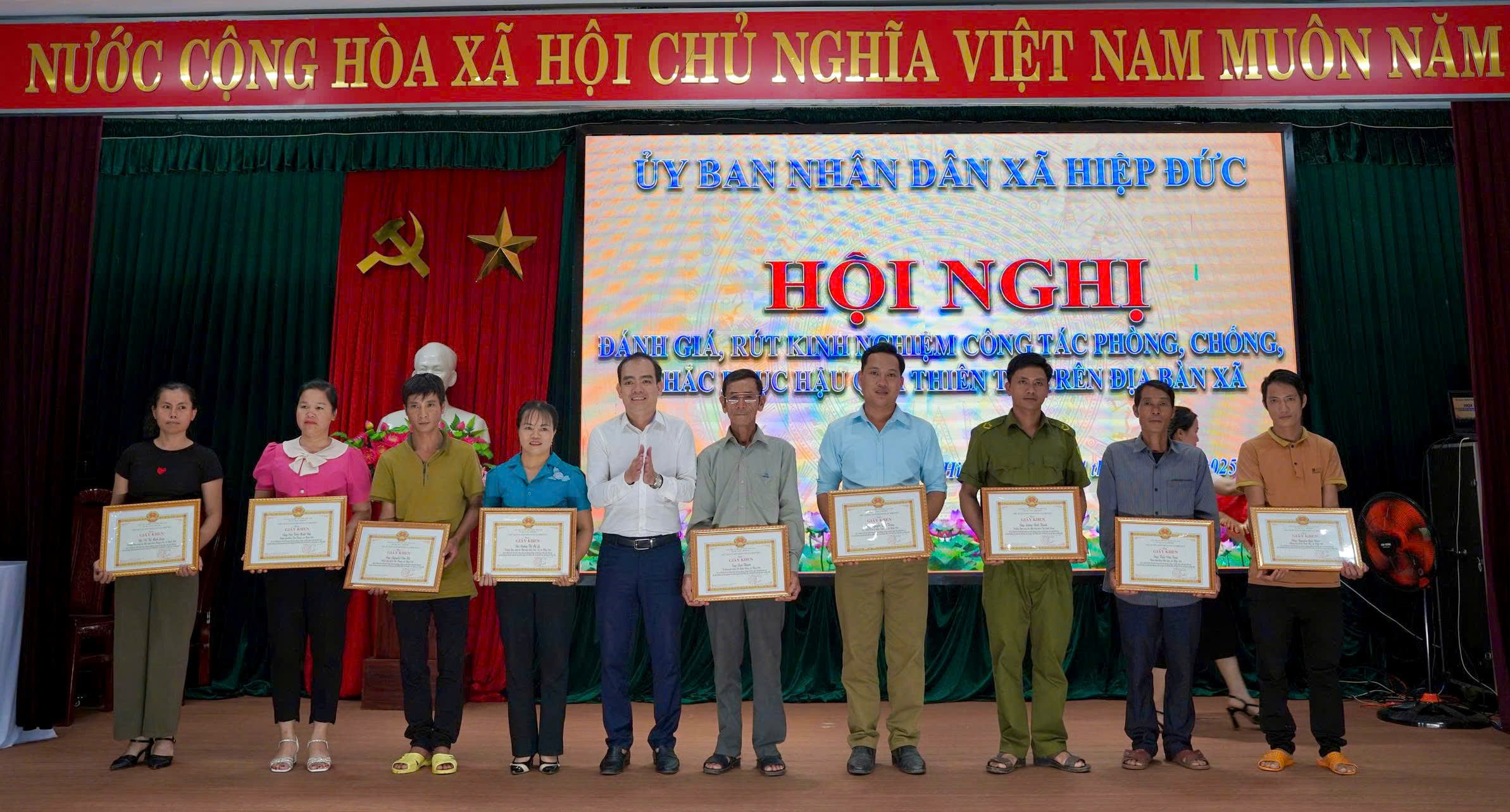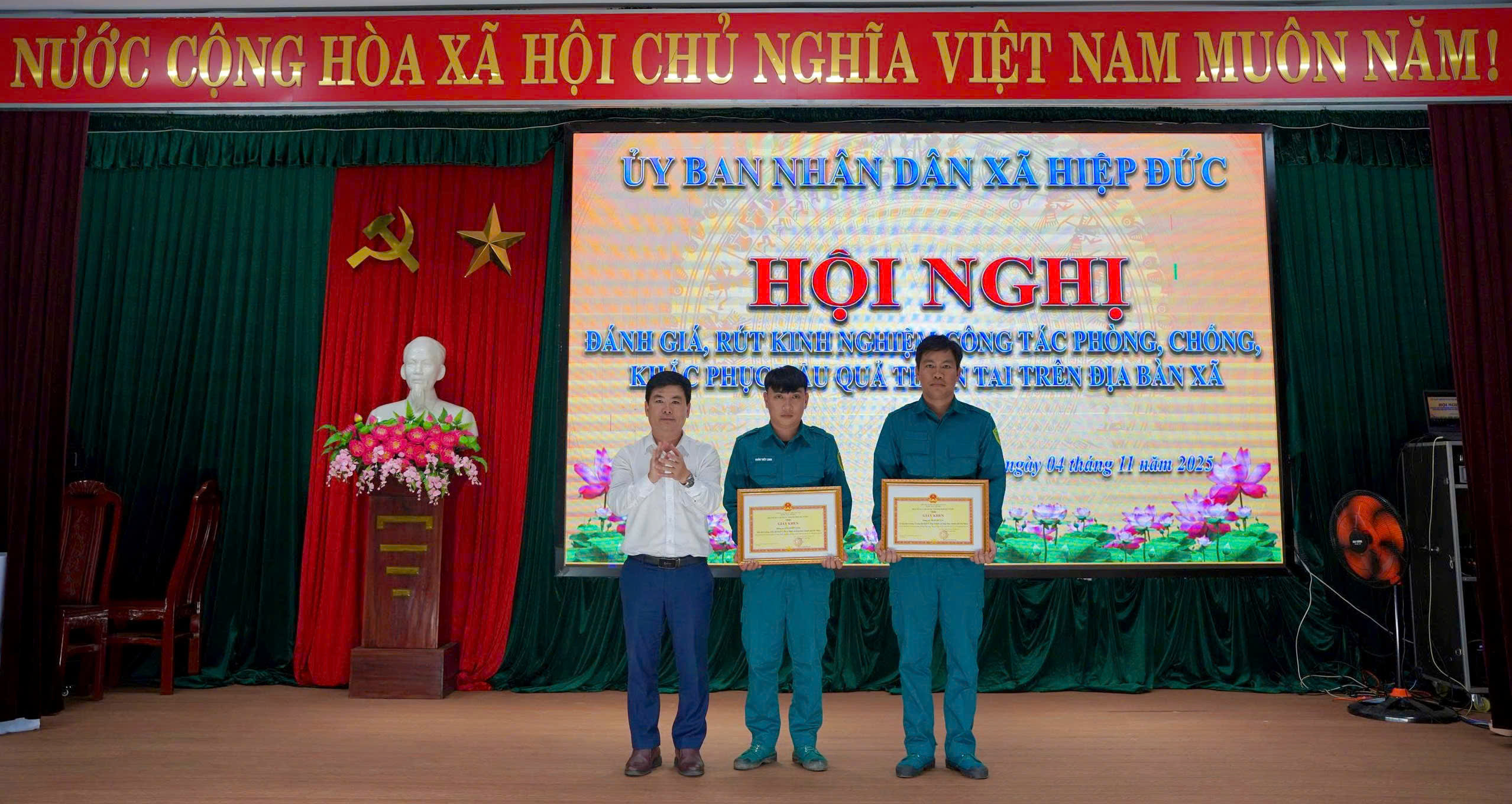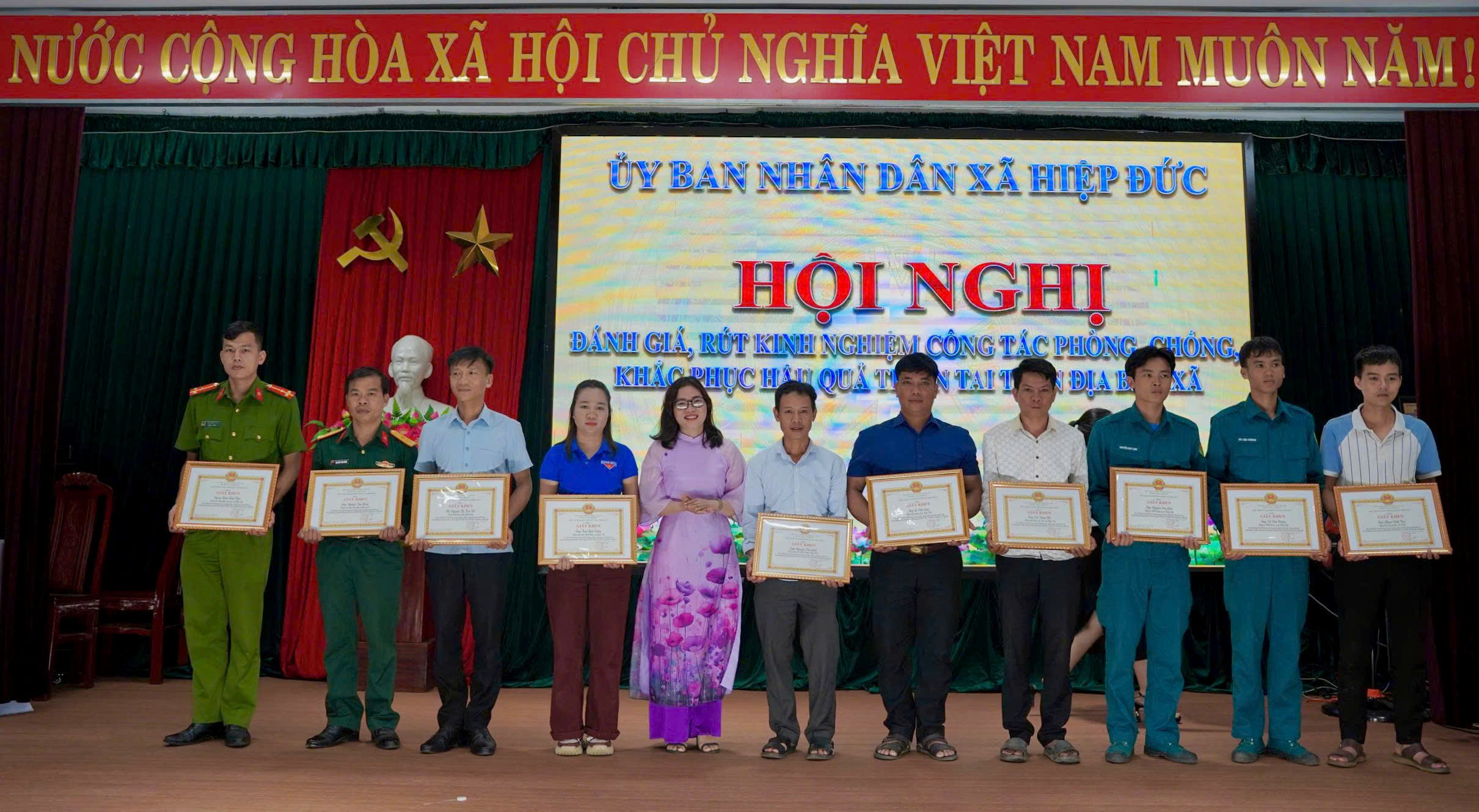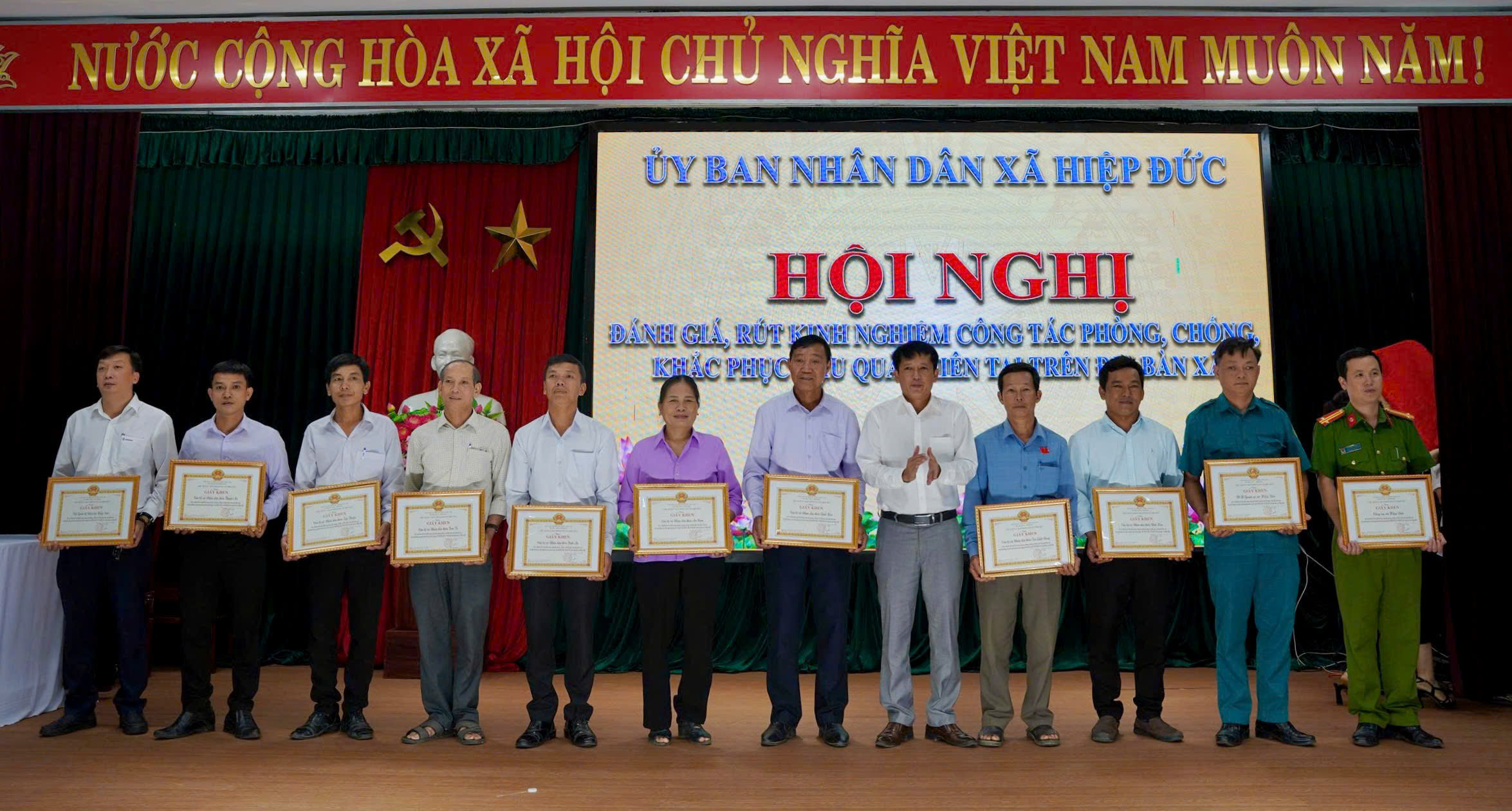 Dịp này, Bộ Chỉ huy Quân sự thành phố Đà Nẵng đã khen thưởng 02 cá nhân có thành tích xuất sắc trong công tác phòng, chống và khắc phục hậu quả mưa lũ do hoàn lưu bão số 12 gây ra. UBND xã Hiệp Đức cũng biểu dương, khen thưởng 11 tập thể và 33 cá nhân tiêu biểu đã có nhiều đóng góp tích cực trong công tác phòng, chống và khắc phục hậu quả thiên tai trên địa bàn.