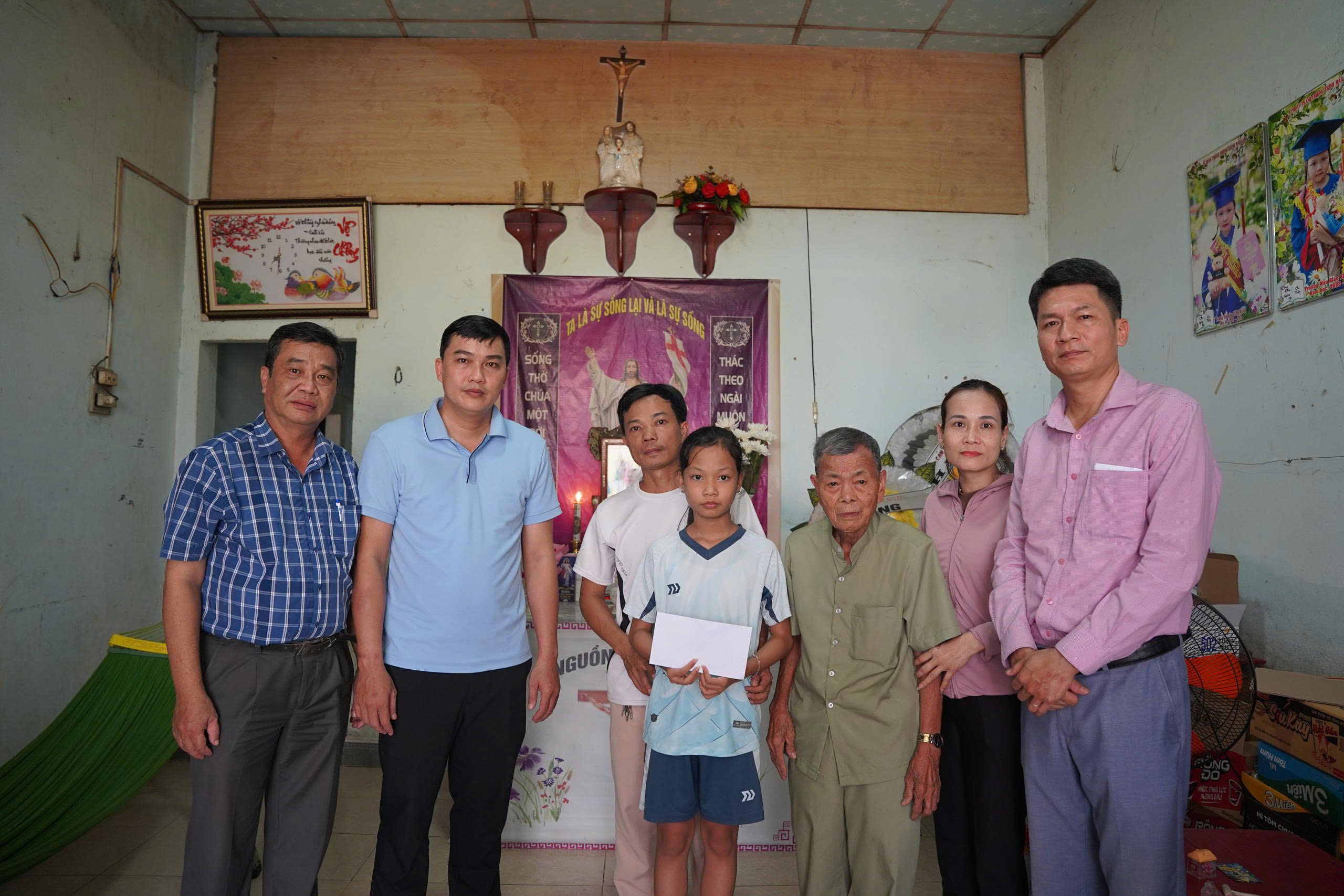 Sáng cùng ngày, Công ty Nam Trung QNH cũng đã đến thăm và trao kinh phí đỡ đầu cho em Nguyễn Thị Hoài Thương, học sinh lớp 5 trường TH&THCS Lê Hồng Phong, với mức hỗ trợ 700 nghìn đồng/tháng. Em Thương mồ côi mẹ từ sớm, hiện đang được người thân chăm sóc, nỗ lực vượt khó học tốt.