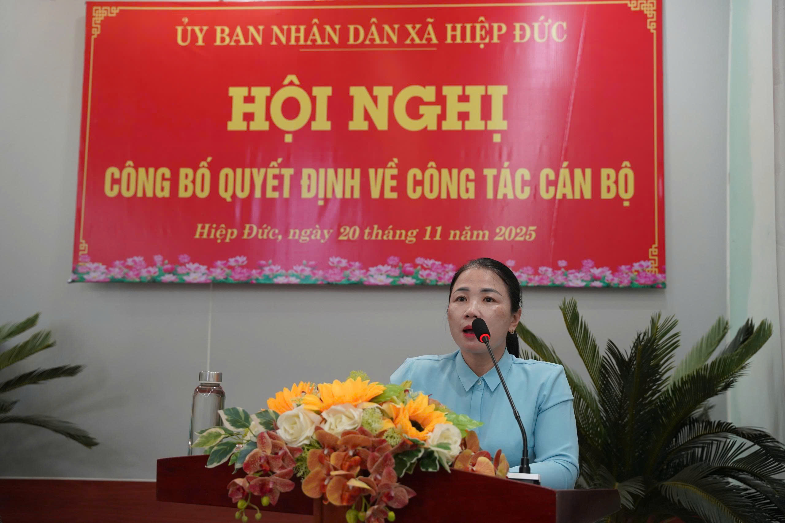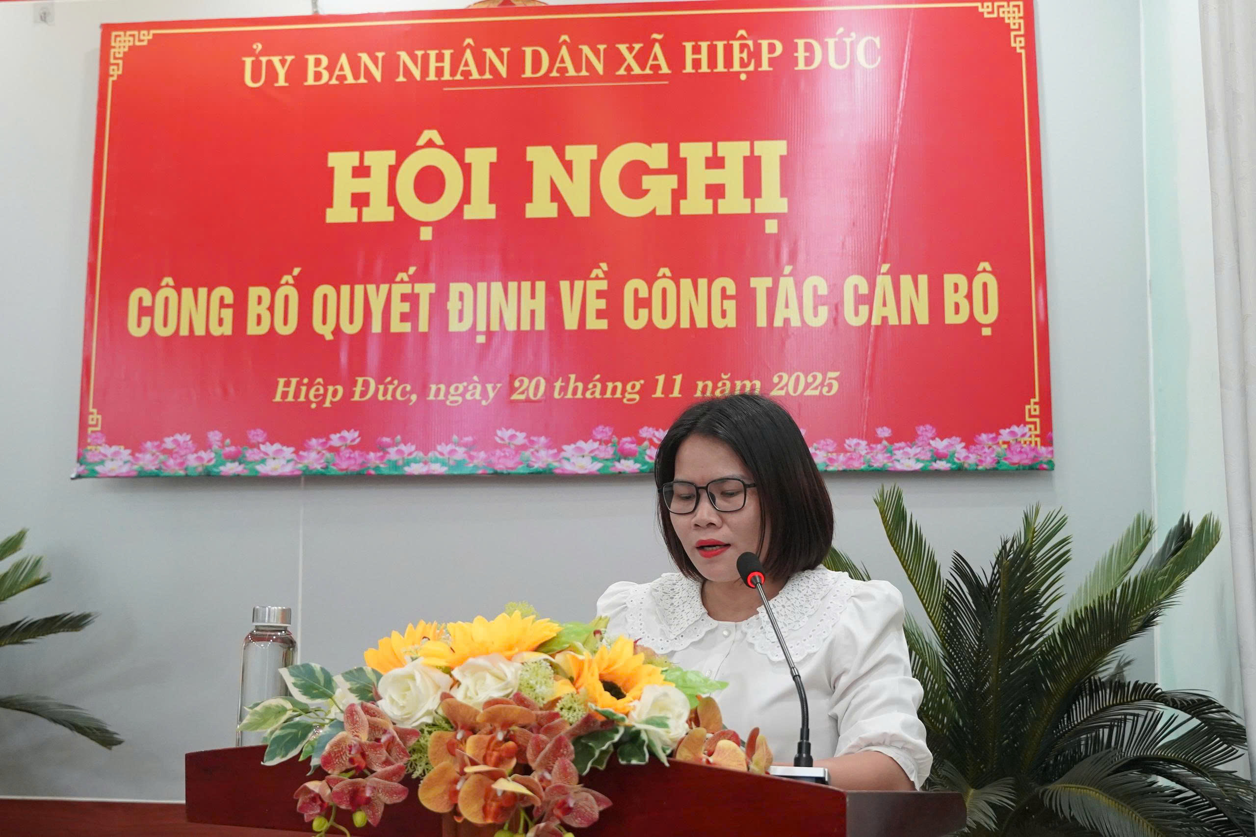 Tại hội nghị, đồng chí Hà Thị Hồng Diêu - Trưởng phòng Văn hoá-Xã hội xã công bố Quyết định về việc điều động, bổ nhiệm bà Nguyễn Thị Lượng – Phó Chủ tịch Thường trực Ủy ban MTTQ Việt Nam xã, đồng thời là Chủ tịch Hội LHPN xã, giữ chức Chánh văn phòng HĐND&UBND xã kể từ ngày 20/11/2025.