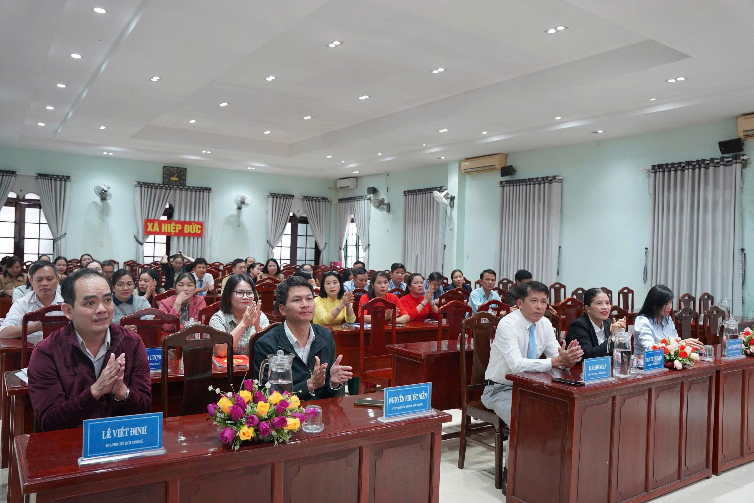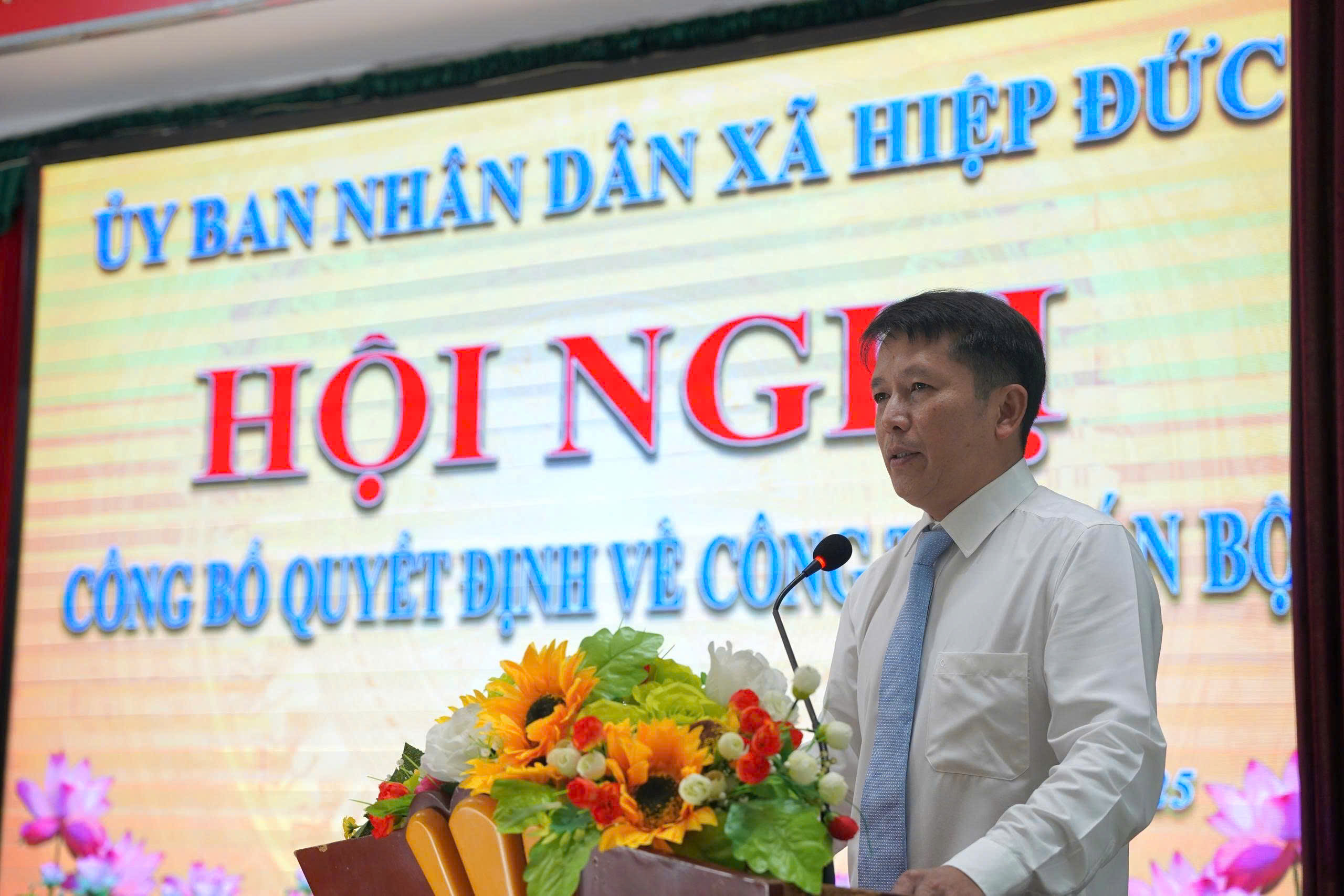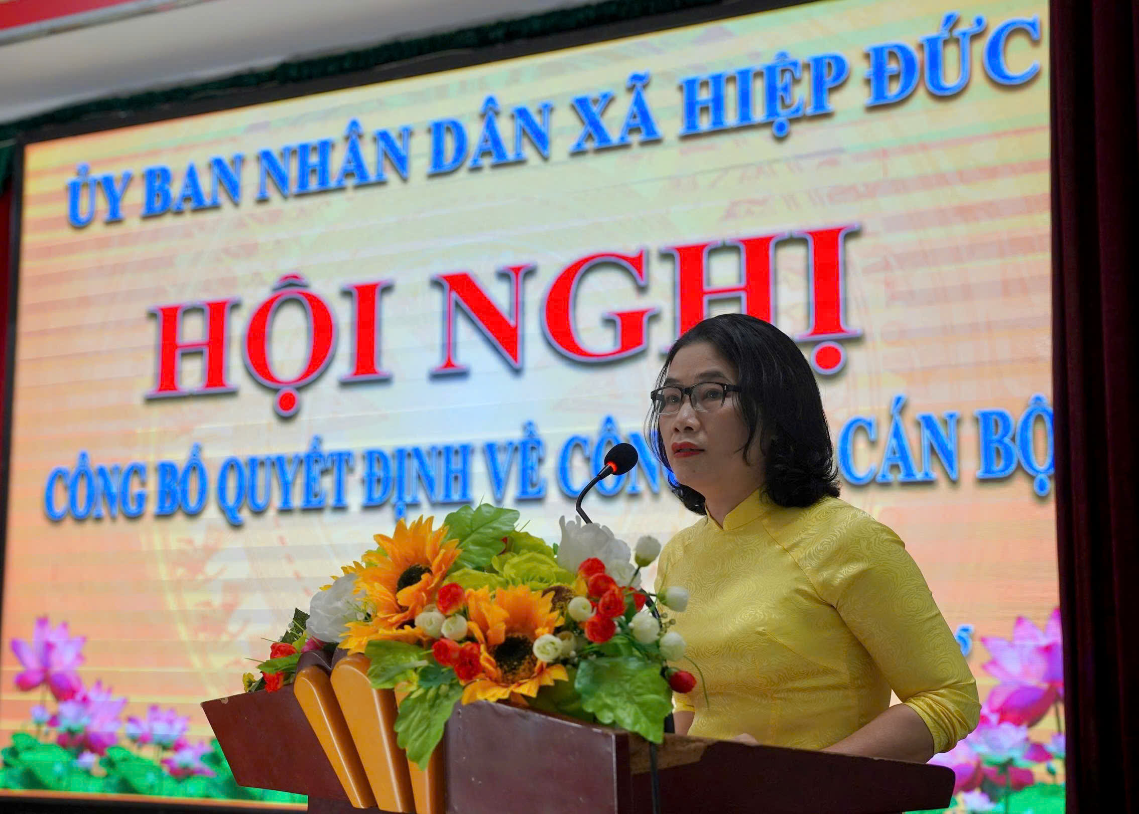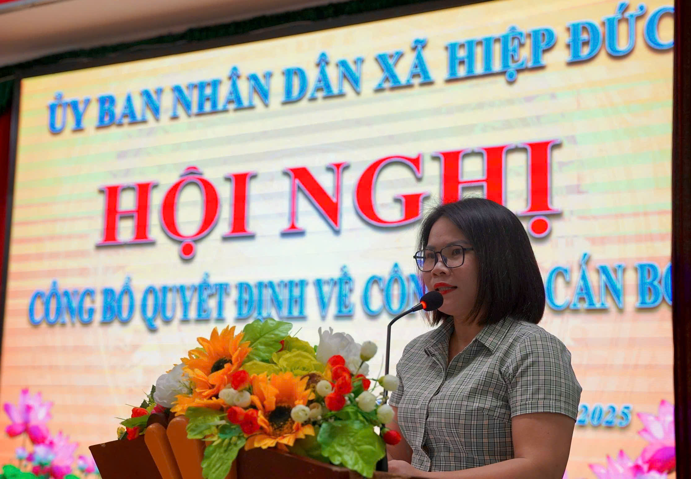 Tại buổi lễ, đồng chí Hà Thị Hồng Diêu – Trưởng phòng Văn hóa - Xã hội đã công bố Quyết định số 134/QĐ-UBND ngày 19/12/2025 về việc bổ nhiệm đồng chí Bùi Thị Bích Hạnh, Quyền Trưởng phòng Kinh tế xã, giữ chức vụ Trưởng phòng Kinh tế xã Hiệp Đức; Quyết định số 136/QĐ-UBND ngày 19/12/2025 về việc bổ nhiệm đồng chí Trần Văn Quyết, Chuyên viên Phòng Kinh tế xã, giữ chức vụ Phó Trưởng phòng Kinh tế xã Hiệp Đức; Quyết định số 133/QĐ-UBND ngày 19/12/2025 về việc bổ nhiệm đồng chí Nguyễn Thị Chung Thủy, Chuyên viên Phòng Văn hóa – Xã hội xã, giữ chức vụ Phó Trưởng phòng Văn hóa – Xã hội xã Hiệp Đức; Quyết định số 137/QĐ-UBND ngày 19/12/2025 về việc bổ nhiệm đồng chí Lê Thị Hồng Huệ, Chuyên viên Phòng Văn hóa – Xã hội xã, giữ chức vụ Phó Trưởng phòng Văn hóa – Xã hội xã Hiệp Đức; Quyết định số 135/QĐ-UBND ngày 19/12/2025 về việc bổ nhiệm đồng chí Nguyễn Hửu Hải, Chuyên viên Văn phòng HĐND&UBND xã, giữ chức vụ Phó Chánh Văn phòng HĐND&UBND xã Hiệp Đức. Thời hạn giữ chức vụ của các đồng chí là 05 năm, kể từ ngày 19/12/2025.